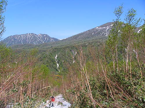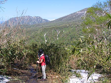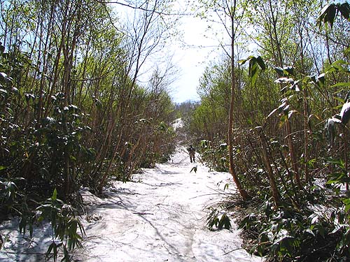 でも、ほぼ一直線の残雪ロード・・・・ 残雪の上にはそんなに障害物らしきものもなし・・ んん〜〜こりゃ〜下山は、絶対尻すべりに限る!(^^ゞ
