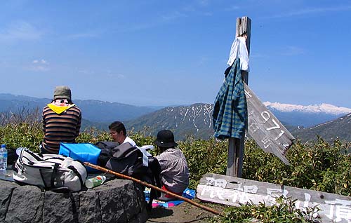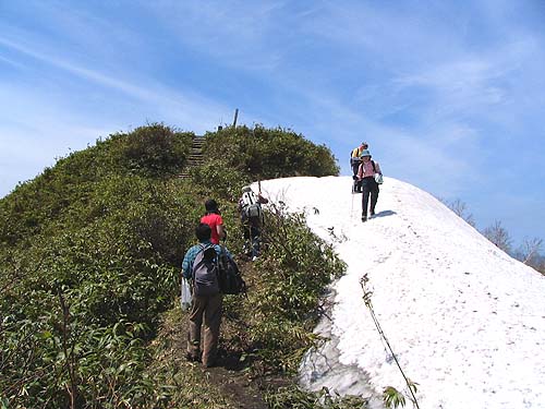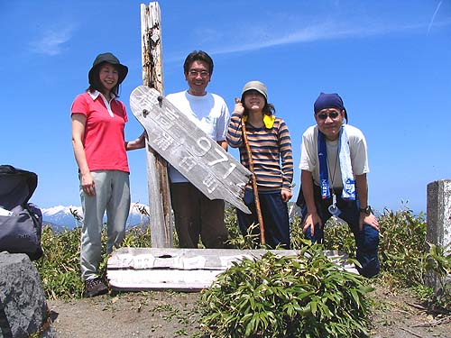 山頂直下で、下山するお二人さんに会います。 「どちらから?」 「はい!浦臼からです」 右手にスーパーバックに詰まった? 山の幸が・・ ウド?なかったのかな? ・ ・ ・ そして、 ・ ・ ・ 隈根尻 ・ ・ 山頂です